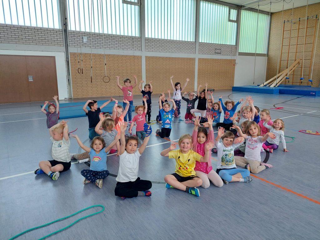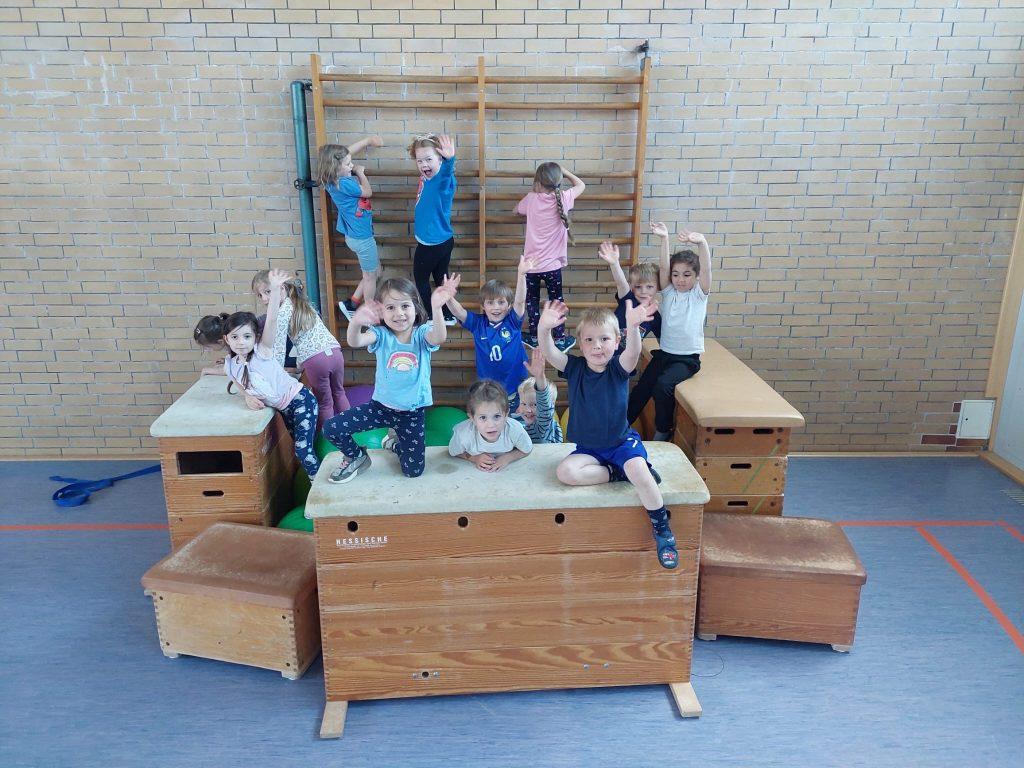 Bei der „Rasselbande“ klappt das Turnen der 4-7jährigen schon ganz ohne Mama oder Papa. Nach einem Anfangslied und einem Aufwärmspiel locken die Geräte. Immer wieder neu kombiniert fördern sie Mut, Balance und Selbstvertrauen. Auch die Stütz- und Haltekraft wird schon mal gezielt trainiert. Der Spaß an der Bewegung steht aber bei allem im Vordergrund. Mit kleinen Spielen und einem Schlusslied endet die Stunde.